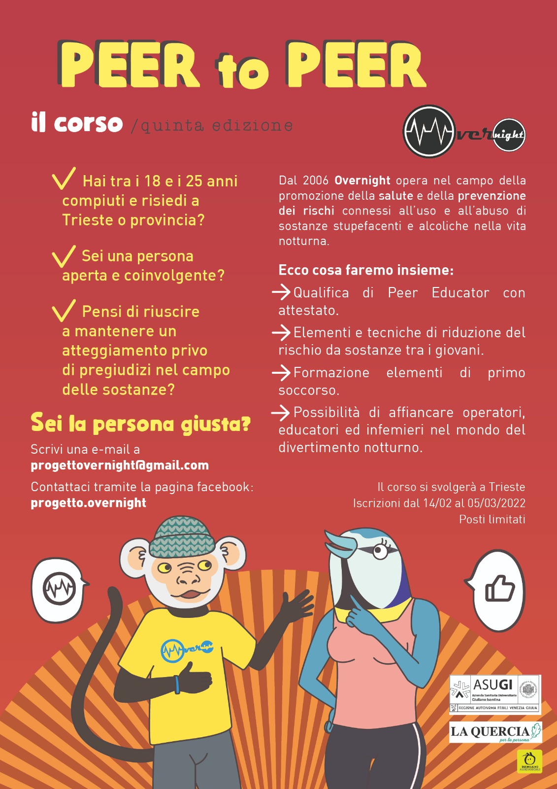 Sono ufficialmente aperte le iscrizioni per diventare Peer Educator del Progetto Overnight, dedicato a ragazzi e ragazze dai 18 ai 25 anni. C'è tempo per iscriversi fino al 5 marzo. Se sei di Trieste e dintorni, pensi di essere un ragazzo o una ragazza apert* e capace di mantenere un atteggiamento non giudicante nel campo delle sostanze, allora questa è l'attività giusta.