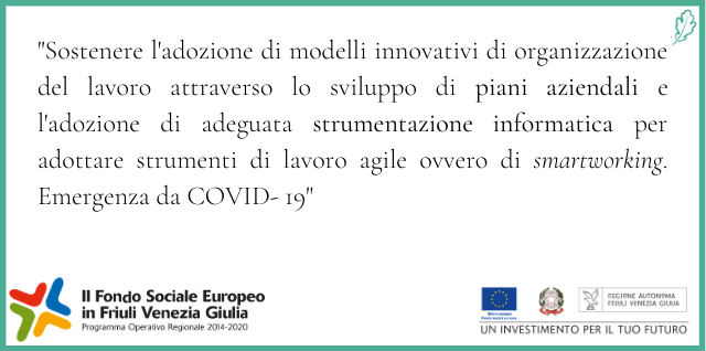 In relazione a ciò, si è beneficiato quindi del sostegno finanziario del Programma Operativo del Fondo Sociale Europeo della Regione Friuli Venezia Giulia in relazione al programma PS 101/2020 – “Sostenere l'adozione di modelli innovativi di organizzazione del lavoro attraverso lo sviluppo di piani aziendali e l'adozione di adeguata strumentazione informatica per adottare strumenti di lavoro agile ovvero di smartworking. Emergenza da COVID- 19”.